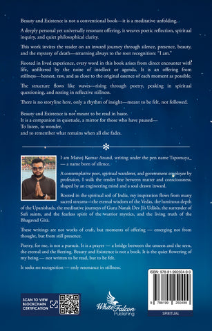 Beauty and Existence is not a traditional book—it is a meditative unfolding. This deeply personal yet universally resonant work merges poetic reflection, spiritual inquiry, and philosophical clarity. It takes readers on an inward journey through presence, silence, beauty, and death—returning always to the root recognition: “I am.”