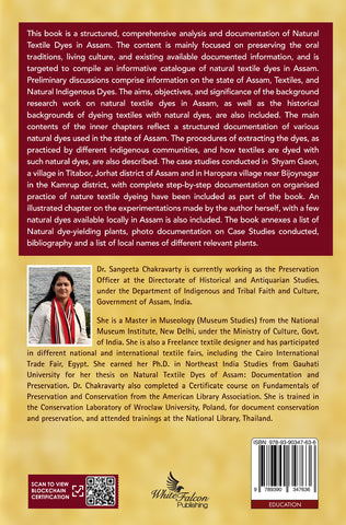 This book is a structured, comprehensive analysis and documentation of Natural Textile Dyes in Assam. The content is mainly focused on preserving the oral traditions, living culture, and existing available documented information, and is targeted to compile an informative catalogue of natural textile dyes in Assam. Preliminary discussions comprise information on the state of Assam, Textiles, and Natural Indigenous Dyes. The aims, objectives, and significance of the background research work on natural textile dyes in Assam, as well as the historical backgrounds of dyeing textiles with natural dyes, are also included. The main contents of the inner chapters reflect a structured documentation of various natural dyes used in the state of Assam. The procedures of extracting the dyes, as practiced by different indigenous communities, and how textiles are dyed with such natural dyes, are also described. The case studies conducted in Shyamgaon, a village in Titabor, Jorhat district of Assam and in Haropara village near Vijayanagar in the Kamrup district, with complete step-by-step documentation on organised practice of nature textile dyeing have been included as part of the book. An illustrated chapter on the experimentations made by the author herself, with a few natural dyes available locally in Assam is also included. The book annexes a list of Natural dye-yielding plants, photo documentation on Case Studies conducted, bibliography and a list of local names of different relevant plants.