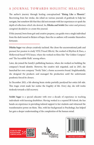 Diksha’s journey through healing conceptualised Rising Like A Phoenix. Recovering from her stroke she relied on various journals of gratitude to help her navigate , but somehow felt they did not resonate with her experience or spark the depth of reflection she desired. So Diksha & Srishti (her sister & primary care-giver) decided to co-create this journal.