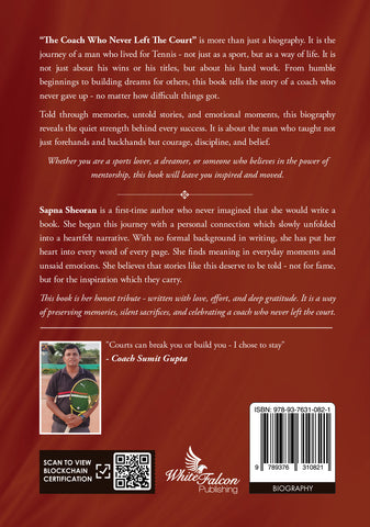 The Coach Who Never Left The Court is more than just a biography. It is the journey of a man who lived for tennis - not just as a sport, but as a way of life. It is not just about his wins or titles, but about his hard work. From humble beginnings to building dreams for others, this book tells the story of a coach who never gave up - no matter how difficult things got.