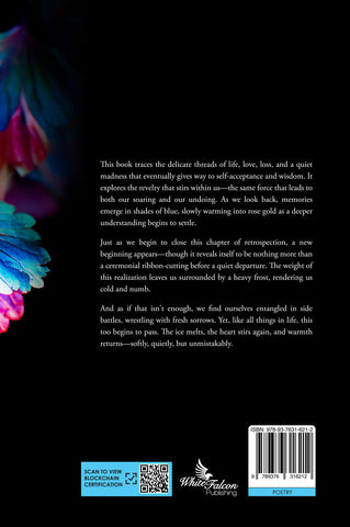 This book traces the delicate threads of life, love, loss, and a quiet madness that eventually gives way to self-acceptance and wisdom. It explores the revelry that stirs within us—the same force that leads to both our soaring and our undoing. As we look back, memories emerge in shades of blue, slowly warming into rose gold as a deeper understanding begins to settle.